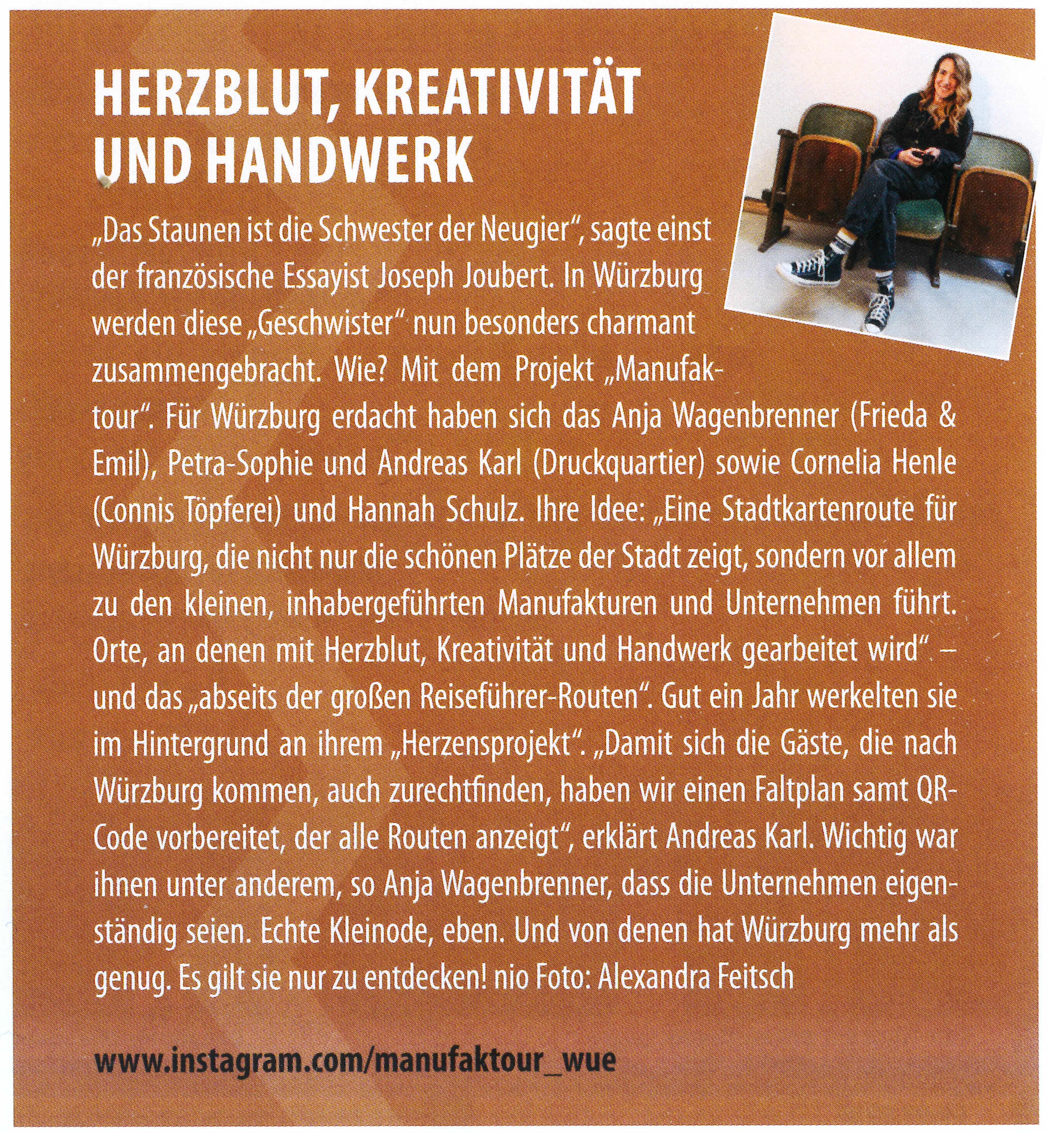 „In Würzburg wächst derzeit ein Projekt, das die Stadt aus neuen Perspektiven erlebbar machen möchte. Unter dem Titel „ManufakTOUR“ entwickeln Petra und Andreas vom Druckquartier, Conni von der Töpferei an der Löwenbrücke und Anja von Frieda & Emil einen hochwertigen Stadtplan. Dieser führt zu über 50 kleinen, inhabergeführten Manufakturen und Werkstätten, die den städtischen Alltag mit Handwerk, Kreativität und persönlicher Handschrift prägen. Wir sprachen mit Anja über das Projekt und dessen Hintergründe.“
